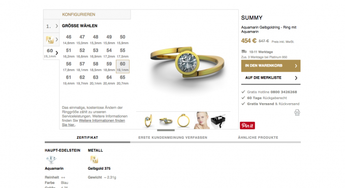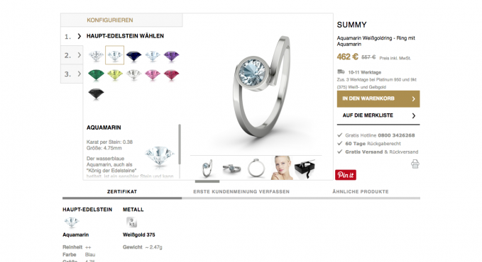 Die Produktvorschau des Ring-Konfigurators ist nahezu fotorealistisch und farblich sehr ansprechend umgesetzt. Eine Zoom-Funktion ist vorhanden sowie kann der Ring aus drei Perspektiven betrachtet werden.