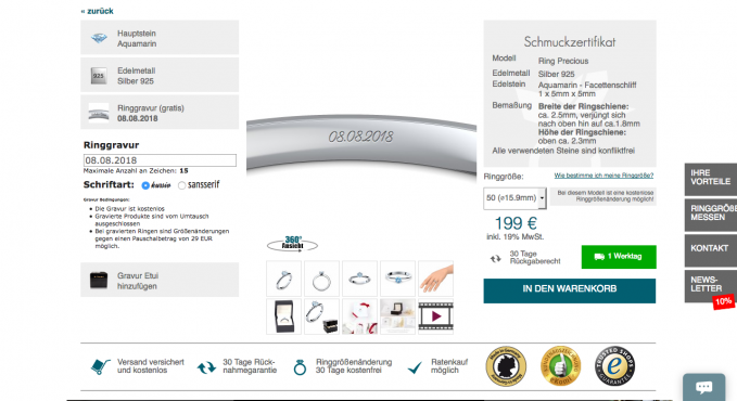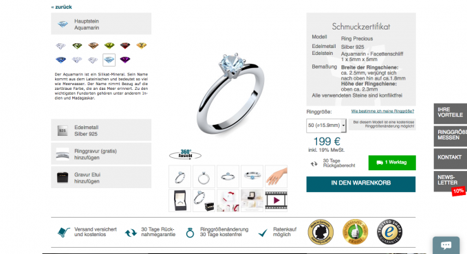 Der Konfigurator wirkt trotz der wenigen Schritte sehr überladen und unübersichtlich. Die Schritte sind zunächst nicht als solche zu erkennen, und müssen erst vom Nutzer gefunden werden. Der Preis und eine Konfigurationsübersicht werden aktuell angezeigt. Eine Speicherfunktion, um den Ring zu einem späteren Zeitpunkt erneut anschauen zu können, ist leider nicht ersichtlich.