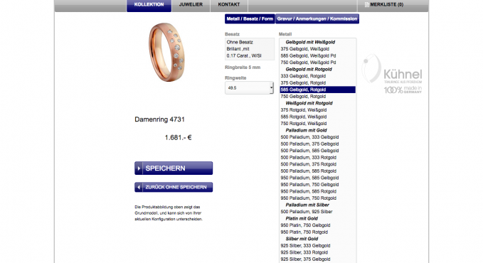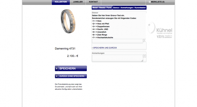 Die Bedienbarkeit ist nicht gut, da die einzelnen Auswahloptionen sehr unübersichtlich untereinander aufgelistet sind und sich die Bezeichnungen zu sehr ähneln. Man gelangt nicht durch intuitives Handeln, sondern nur durch Ausprobieren an sein Ziel. Im zweiten Abschnitt "Gravur" werden Bilder der möglichen Symbole fehlerhaft dargestellt. Es besteht leider nicht die Möglichkeit Damen- und Herrenring parallel voneinander zu konfigurieren, wodurch man nicht das Gesamtbild betrachten kann. Der aktuelle Preis wird angezeigt, und eine Speicherungsoption ist vorhanden, welche allerdingt nicht funktioniert hat.