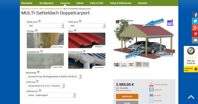 Die Auswahl an bereits vorkonfigurierten Carports ist zwar gut, die weiteren Individualisierungsmöglichkeiten allerdings eher gering.