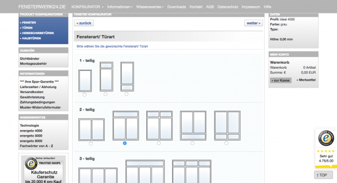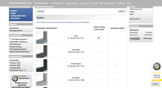 Der Konfigurator besteht aus vielen Schritten, welche recht viele Auswahloptionen beinhalten. Man kann sogar unterschiedliche Fensterfarben für außen und innen wählen. Zudem kann man Zusatzoptionen wie etwa Rolladen oder Fensterbänke auswählen.