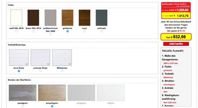 Hinsichtlich einer individuellen Garagentor-Konfiguration stehen dem Nutzer eine durchschnittliche Anzahl an Auswahloptionen zur Verfügung.