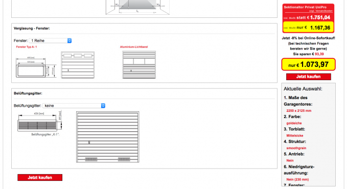Eine Produktvorschau des konfigurierten Garagentors ist leider nicht ersichtlich. Es wird zu Anfang lediglich ein Beispiel-Modell gezeigt.