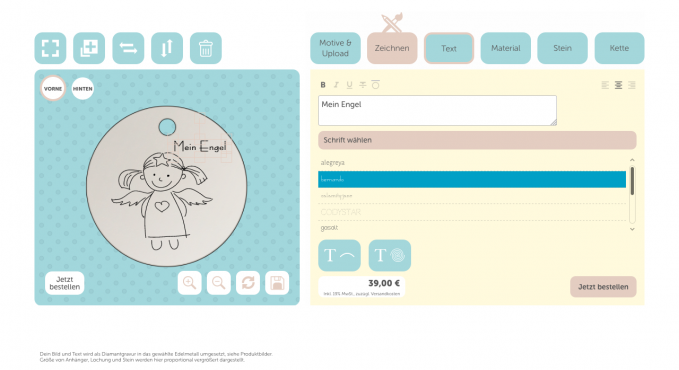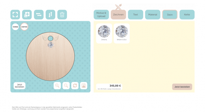 Der Individualisierungsgrad ist hoch. Man kann Schmucksteine sowie den Text frei platzieren und sogar mit der Maus etwas auf den Anhänger zeichnen. Man kann unter dem Konfigurator aus einer großen Bildergalerie weitere Motive in den Konfigurator übernehmen.