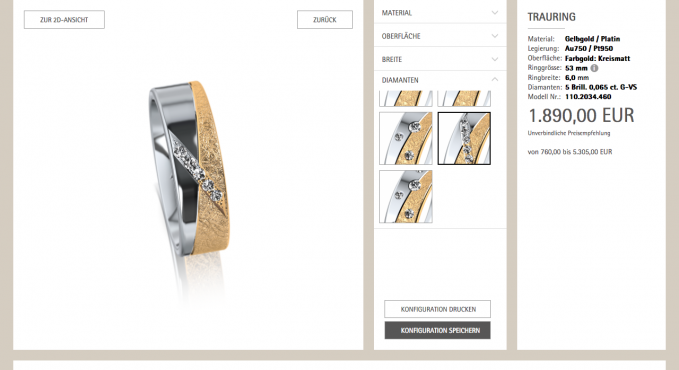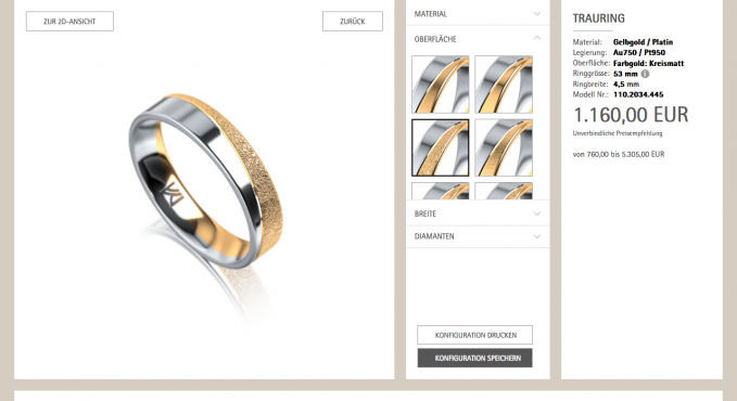 Die fotorealistische Produktvorschau ist sehr gut gelungen. Man kann sich den Ring aus nahezu jeder Perspektive anschauen und es besteht die Möglichkeit den Ring heranzuzoomen.