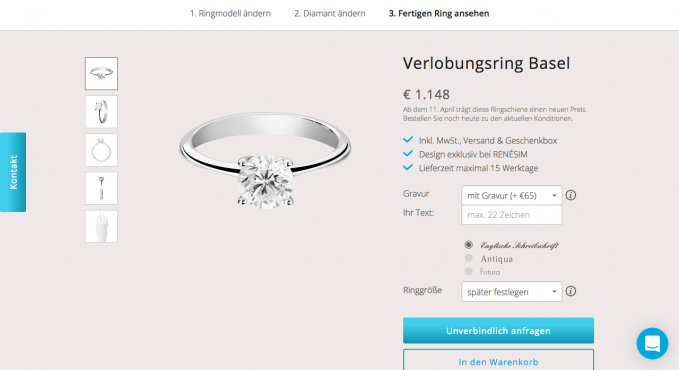 Man wählt zunächst aus einer Großzahl an Modellen einen Ring sowie dessen Material aus. Im nächtsten Schritt kann man neben dem Diamanten eine persönliche Gravur hinzufügen.